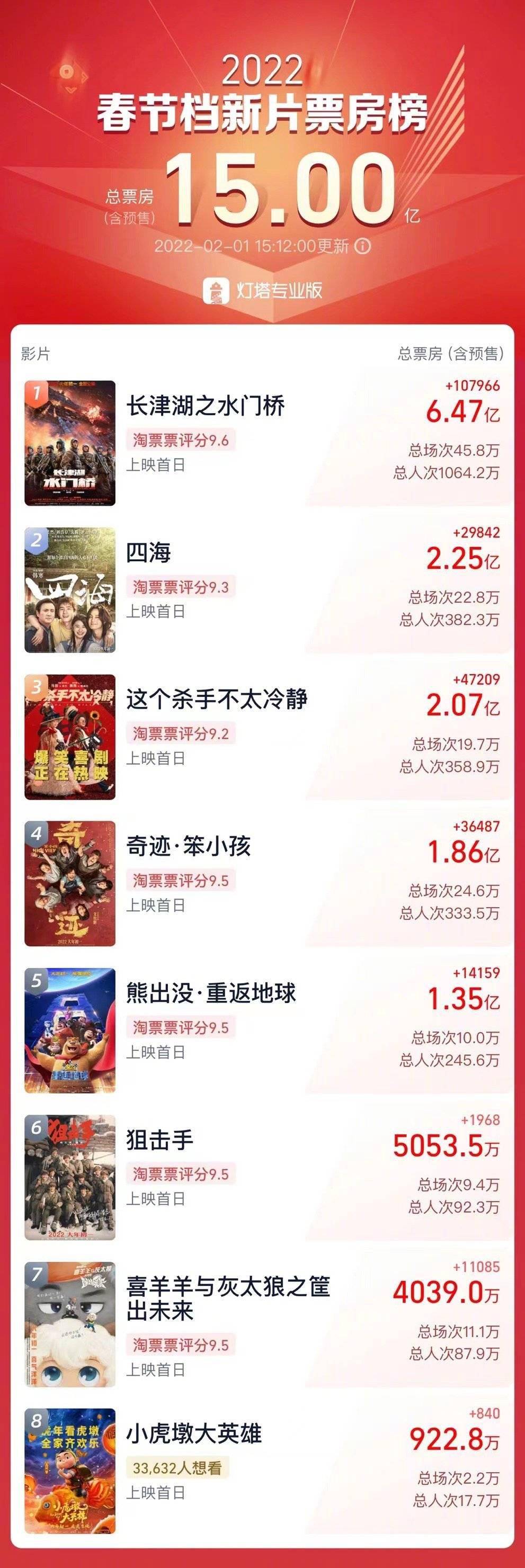 2022春节档电影票房破15亿《长津湖之水门桥》9.6分+6.47亿夺冠