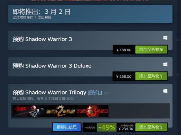《影子武士3》开启预购标准版188元 全系列捆绑包五折
