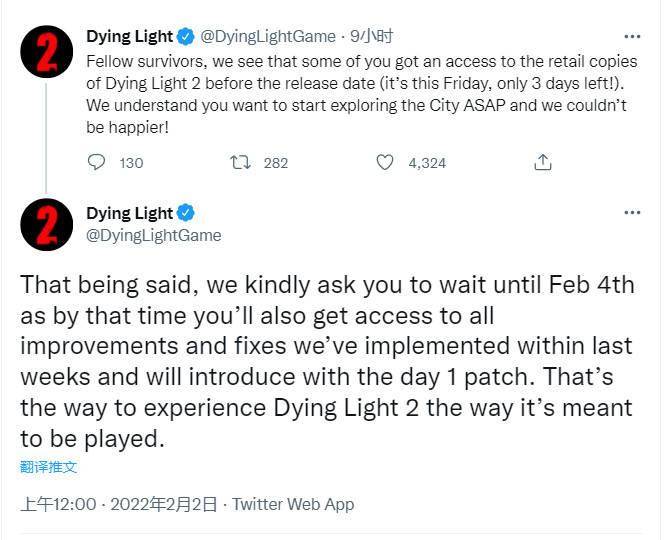 在Twitter上,Techland呼吁那些成功提早将游戏拿到手的玩家等待2月4日那天再游玩游戏。Techland解释说目前这款游戏“不完整”,但稍后会有首日补丁更新。