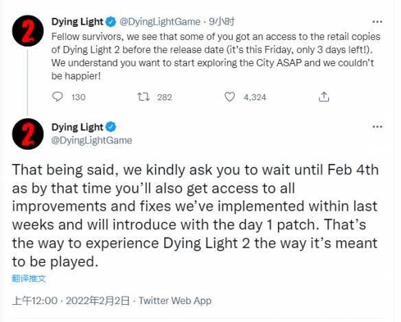 Techland在推特上呼吁那些成功提早将游戏拿到手的玩家等待2月4日那天再游玩。Techland解释说,目前这款游戏“不完整”,但稍后会有首日补丁更新。