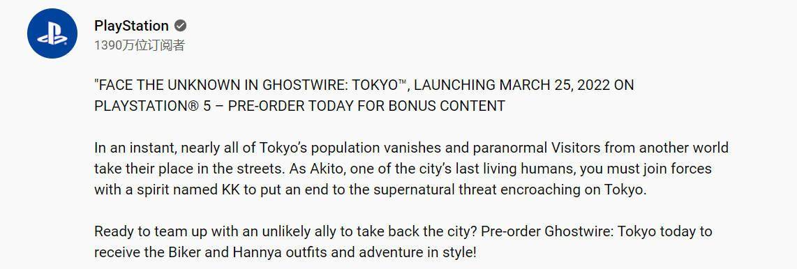 SIE宣布《幽灵线:东京》PS5版游戏演示将于北京时间2月4日早晨6点公开,该作将于2022年3月25日发售,登陆PC和PS5平台。主机版为PS5独占一年。