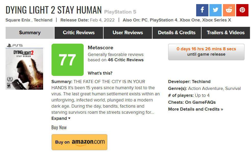 《消逝的光芒2》媒体评分已在昨晚解禁,外媒IGN打出7分评价,而GameSpot仍在评测当中,临时评分只有6分。截止到发稿时,MTC收录了46家媒体评分,当前平均分77分。