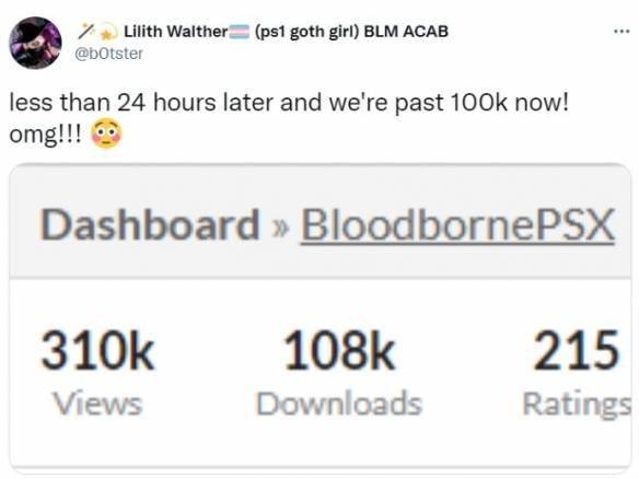 游戏制作者 Lilith Walther 在其个人账号上分享了她的震惊和喜悦。当这款游戏超过5万下载量时,她就简单发送了一个感谢推文,但当游戏在不到一天的时间里下载量就突破10万时,她惊叹道:“不到24小时,我们现在已经突破了10万!OMG!!!”相信随着“《血源》登陆PC”消息的传播,这个数字肯定会在未来持续攀升。