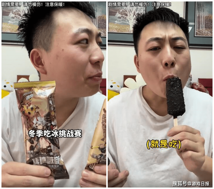 有着这样的奖励,再加上此次联动本来就已经有了一定的知名度,于是这个“冬日吃冰热血挑战赛”一开启吸引了无数玩家的参与。这其中既有同人大触直接通过双手,创造出活动相关的同人画作,同时也有不少人真人出镜,表演一段让人忍俊不禁的小剧场。