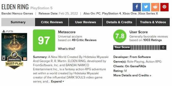 PS5版本:M站 媒体评分97分,玩家评分7.8分