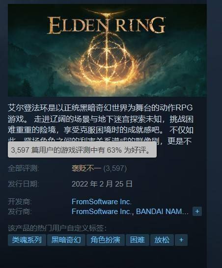 果然,Steam玩家评分出来后,全网炸锅了!被各大媒体奉为史诗级完美之作的《老头环》,Steam好评率竟只有63%!