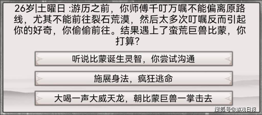 在游戏的过程中,每一个选择都是机遇与风险并存的。举个例子(游戏日报君的某局游戏体验),出门游历前师父多次叮嘱不能去裂石荒漠,结果自己还是到了,碰到了蛮荒巨兽比蒙。这时候出现了三个选择,和它交流、逃跑或者是跟它硬刚。