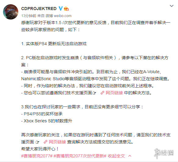 好消息是,刚刚CDPR发布公告,称PC版的热修复已经上线,解决了游戏运行时与音频驱动软件相关的崩溃问题 。想在1.5版本后重回夜之城探索的玩家,或者是趁打折入坑的新玩家,可以正常启动游戏了。