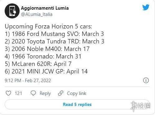 @ALumia_Italia是一个追踪Xbox内部人士Hub消息的页面,今天ALumia_Italia发布推文,爆料了即将加入《极限竞速:地平线5》的车辆,车辆列表如下: