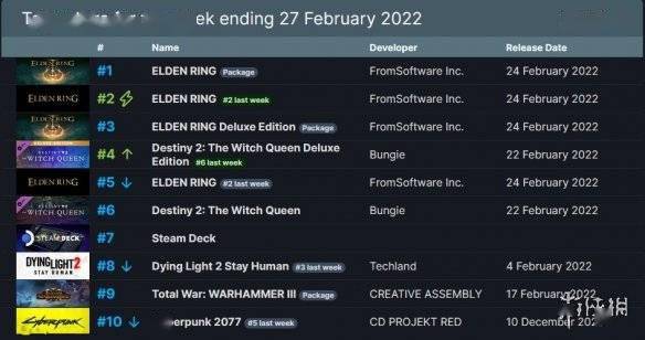 Steam新一周销量榜(1月21日~2月27日)现已公布,《艾尔登法环》意料之中的表现给力,TOP5里有4个都是它,还实现了Steam在线人数第一成就,目前除了优化问题,游戏内容方面令人满意,steam评价也转为多半好评(73%).