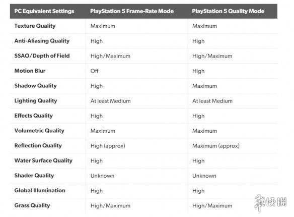 此外,《艾尔登法环》在PS5上面有“帧数模式”和“品质模式”两种模式可选,而数毛社也提供了一份表格,将这两种模式跟PC上的画质选项对应了起来。