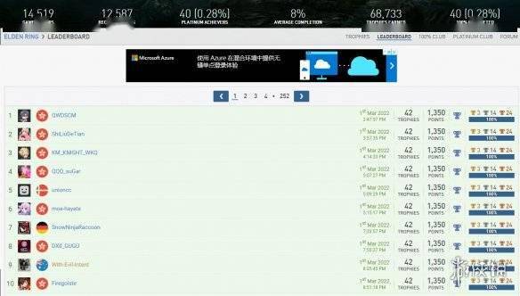 据统计网站 PSNProfile 显示,目前已有40位PS平台玩家获得了《艾尔登法环》的白金奖杯,而第一名获得白金奖杯的是一位id“QWDSCM”的中国玩家。其中前10名玩家中有7名来自港服。
