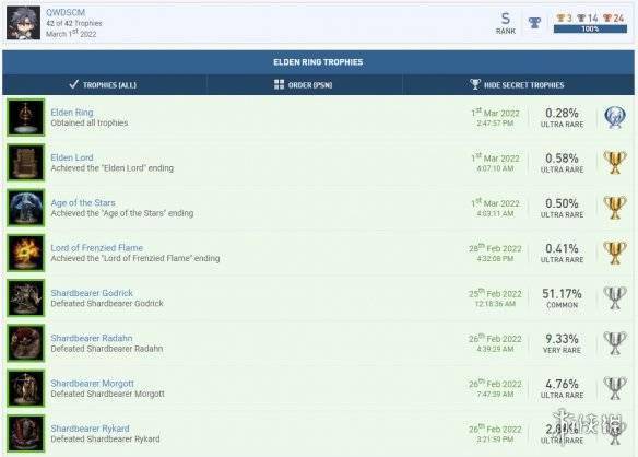 据页面显示,QWDSCM 这位玩家是在3月1日下午达成的成就,耗时4天21个小时。《艾尔登法环》共包含了42个奖杯,一个白金、3个黄金、14个银杯以及24个铜杯,3个黄金奖杯则对应三个结局。白金奖杯的获得者仅占0.28%,平均完成率为8%。