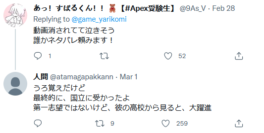 6年过去了,虽然マタドール早已删除当时的直播片段,但也有知情的网友在投稿下留言表示,后来マタドール虽然还是没有如愿考进东京大学,但被其他的国立大学录取,与マタドール原本在高中的成绩比起来,已经算是进步很多了。