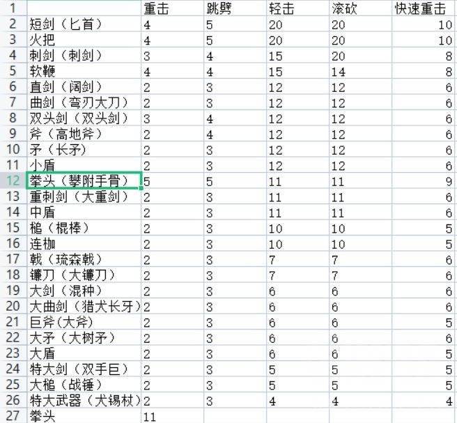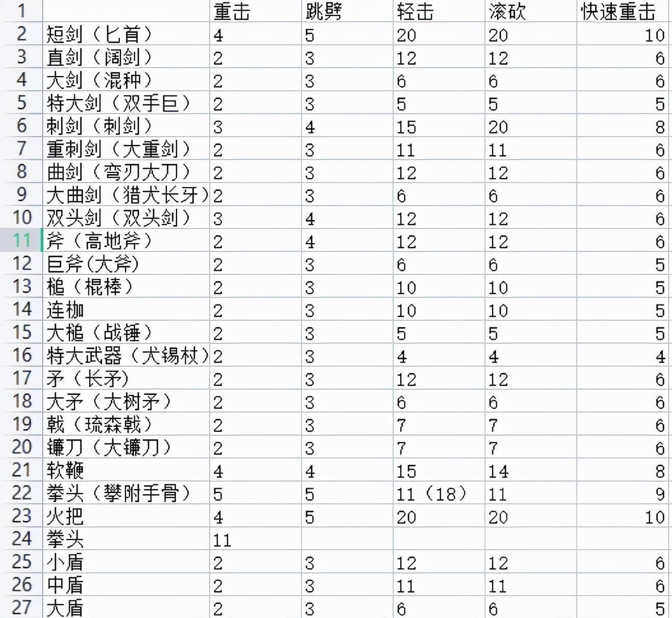 其中,重击指的是续满力的重击第一段,跳劈为重击跳劈,轻击为轻击攻击第一段(连段的最后一击的削韧值应该更高,比如直剑第一段12下击倒而5连击只需要两轮),滚砍为滚砍轻击,快速重击为不蓄力直接释放重击。