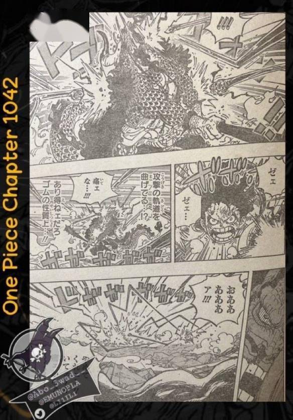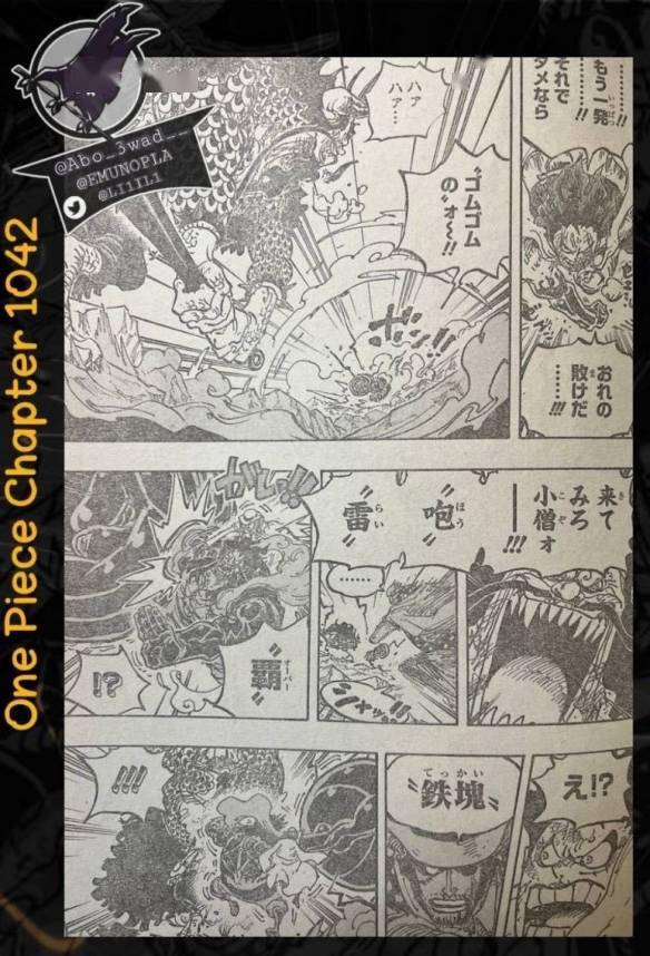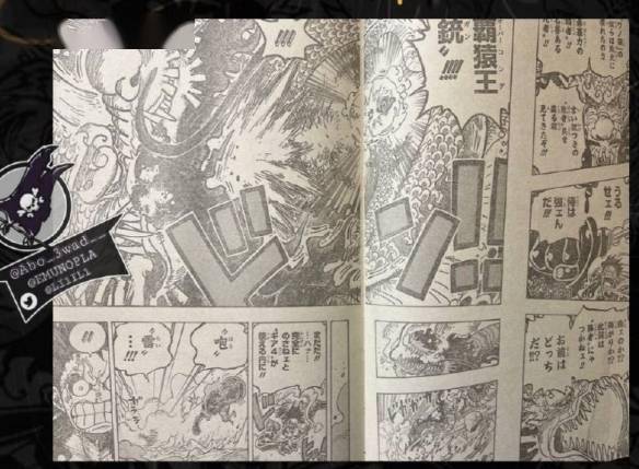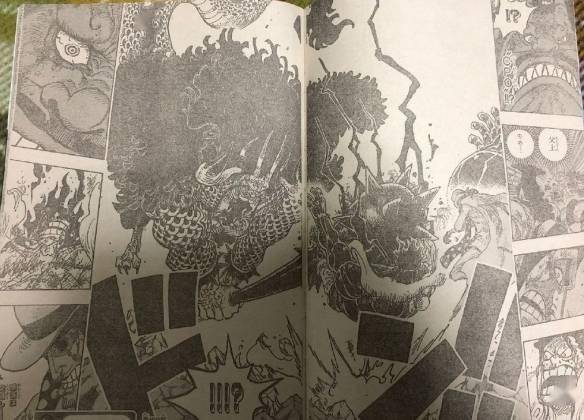 在精彩的跨页中,凯多用缠绕霸王色的狼牙棒猛击路飞。“咆雷八卦”正中路飞的躯体(凯多的铁棒像球棒那样打中了路飞的身体)。路飞因CP0小队长分心了,没能摆出防御架势。CP0小队长及时撤走,所以攻击并没有影响他。