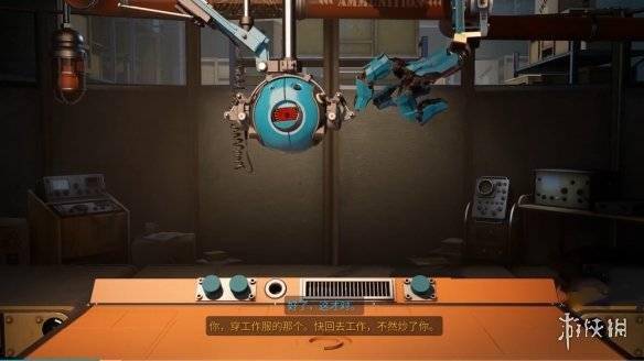 直到我们到了自己的工作台,一个像眼球一样的,蓝色的圆形机器人Grady出现了。它敲着自己脑壳上的开关,局促地道歉:“啊,有点问题,我搞错了录音带…”,接着掐掉卡尔·乔纳森的高谈阔论,放上他另一段录音,没有激情和梦想,这次的乔纳森一副资本家的腔调:“你,那个穿工作服的。快回去工作,不然炒了你!”
