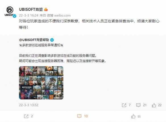 育碧官方发布微博:对各位玩家造成的不便深表歉意,相关技术人员正在紧急排查,请玩家耐心等待!