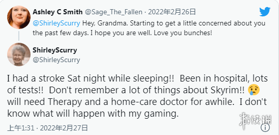 “天际奶奶”在2月25日回复推特上粉丝的相关询问时,透露了自己健康状况不佳。她表示自己在睡梦中中风了,中风的后遗症使得她对《老滚5》的记忆衰退了,而且她甚至“不记得游戏会发生什么”。