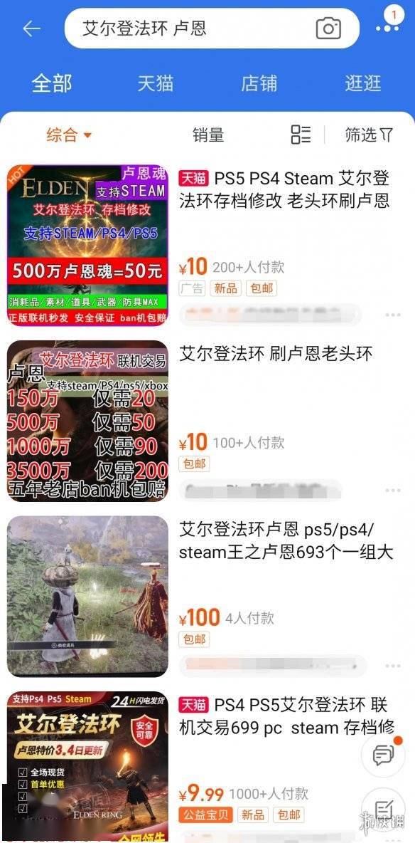 淘宝上也不例外,搜索“艾尔登法环 卢恩”等关键词,立马也会显示一大堆正在进行销售的商家。