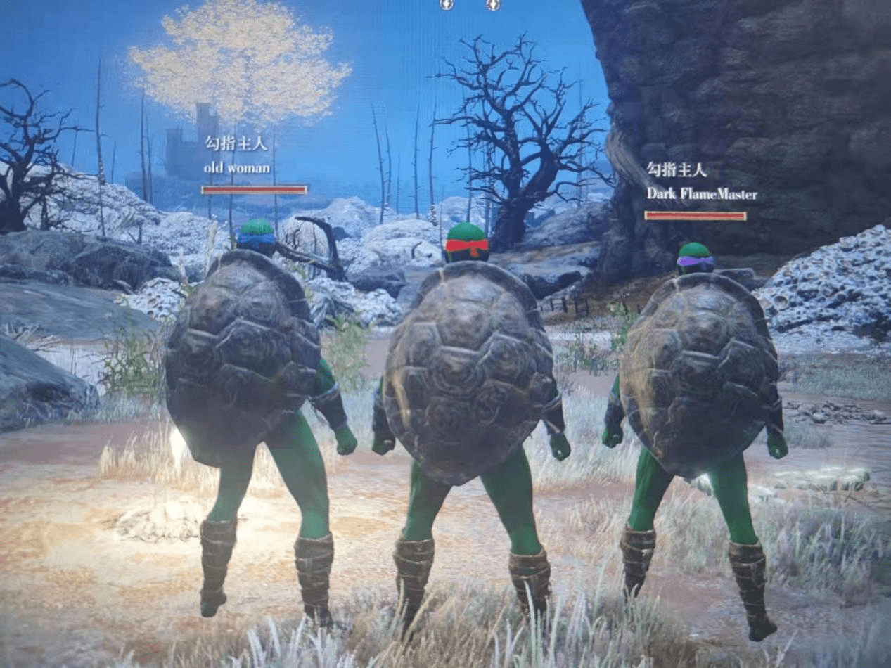 因为本作最优质的前期盾牌之一,是在啜泣半岛拿的“乌龟盾”,而在“捏脸”时选择饰品的时候,有着眼罩的选项。故而,在目前的玩家群体中,最为流行的造型之一就是——忍者神龟。