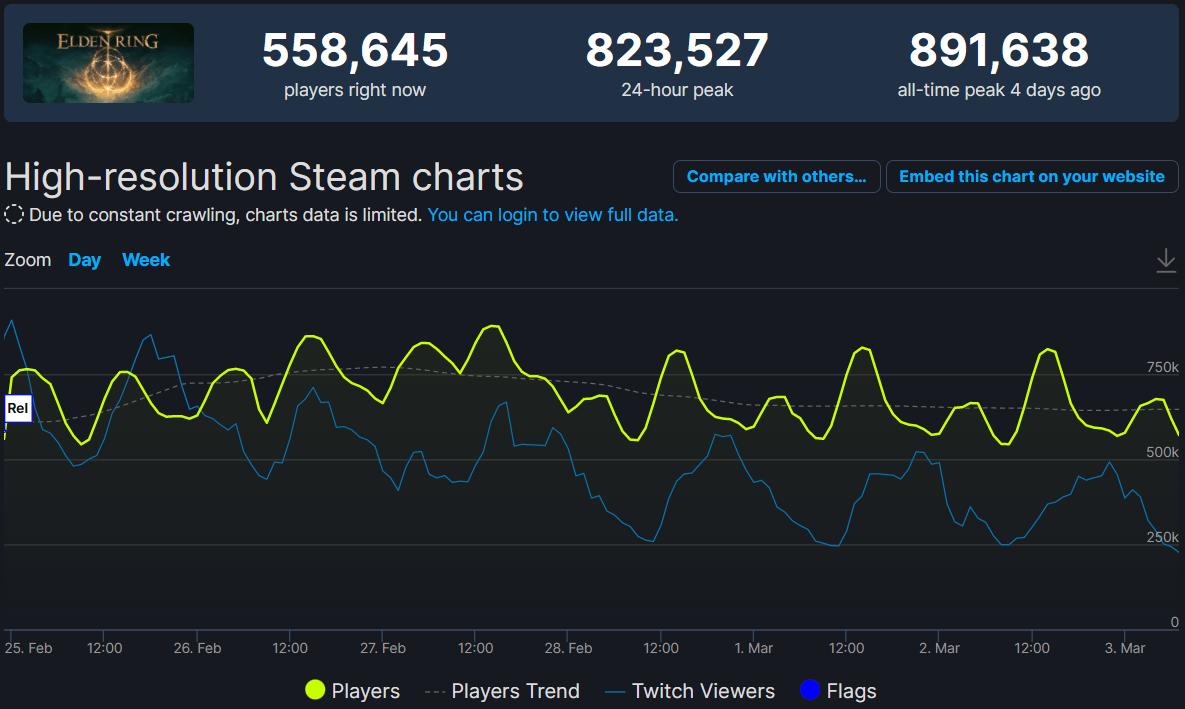 虽然2022年才过去两个多月,但如果要评选2022年度游戏圈内的盛事,那么《艾尔登法环》的发售,必然能够占据一席之地。不说别的,光是Steam同时在线人数最高逼近90W,就已经足以称之为一个“奇迹”。一贯喜好在游戏中“折磨”玩家的宫崎英高大概也不会想到,会有这么多玩家愿意化身“抖M”,一起加入“老头环”的受苦之旅。