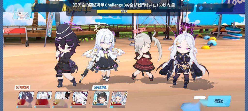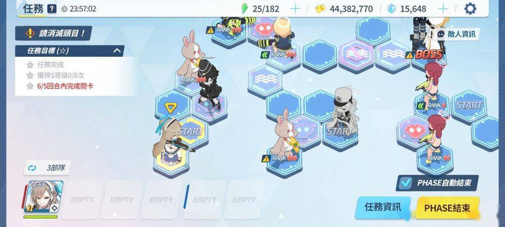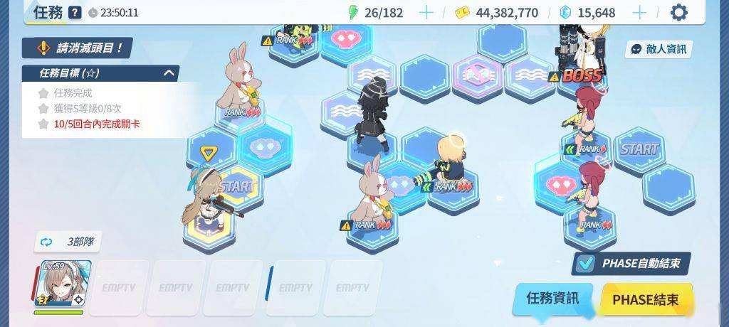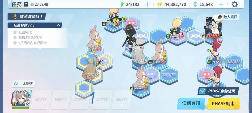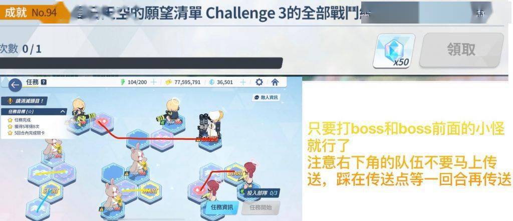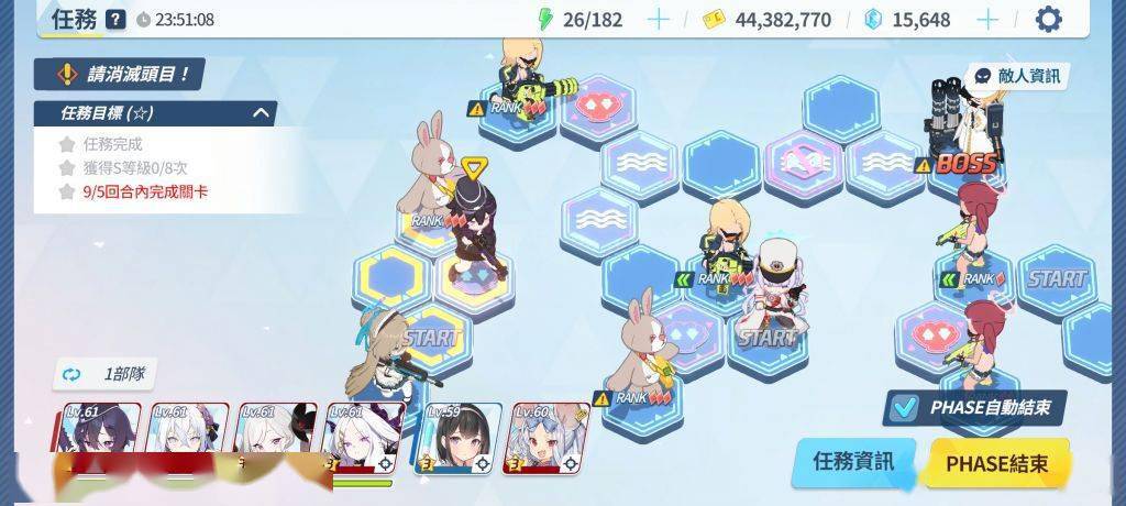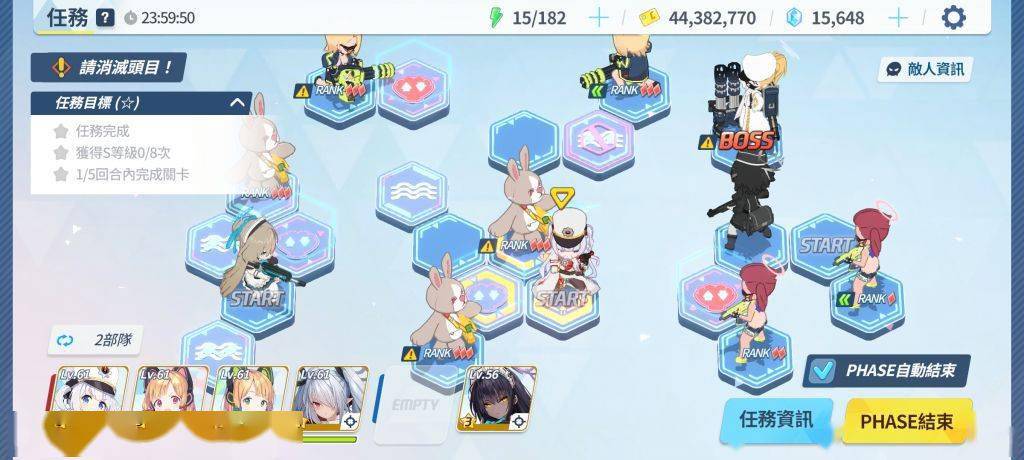 通过几次的尝试,终于找到了理论解法——首先,这个解法的前提条件是贯穿队练度高于爆发队能在60秒内快速杀熊(只要有小桃就很容易达到)最左边的开始格随便塞,中间塞上全部的贯穿输出死不死无所谓(我上的是斯大萝+双子+佐仓的打球小分队),最右边就是常规的boss攻坚队(下文简称boss队)