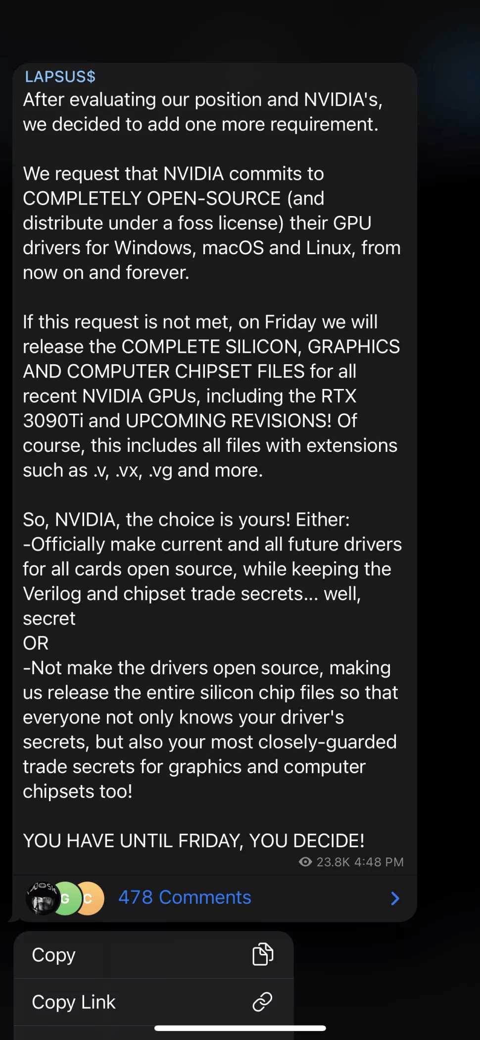周二 Lapsus$ 修改了其要求,并表示英伟达必须在 3 月 4 日星期五之前将所有当前和未来的 GPU 驱动程序开源。如果英伟达不遵守,该组织威胁要在一个公共 Telegram 消息组中发布有关硅芯片文件的信息以及它所谓的“图形和计算机芯片组的严密保护的商业机密”。