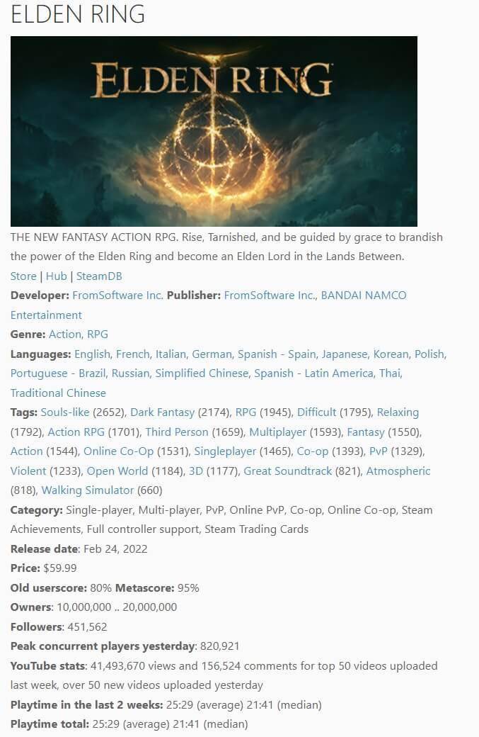 两天前我们曾经报道过,《艾尔登法环》的PC版销量已经突破五百万套。今日SteamSpy再次更新数据,其中显示《艾尔登法环》的Steam版仅用一周时间便突破一千万套销量成绩。