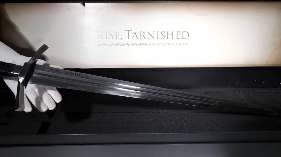 这份限量媒体礼盒全球仅制作了 40 份,其中包括木制的挂牌、一份游戏起始地区地图以及一份感谢信。重头戏则是一把真正的直剑,上面印有“艾尔登法环”字样,以及一件主题披风。
