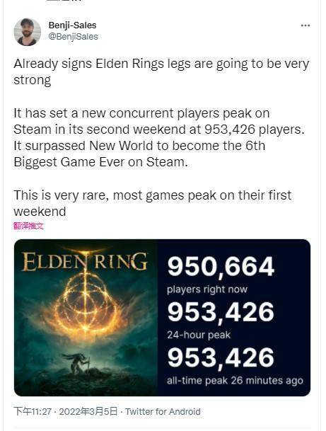 根据SteamDB,《艾尔登法环》Steam在线峰值再创新纪录,在发售的第二个周末同时在线玩家达到了95万3426人,击败了亚马逊的网游《新世界》(91万3634人),成为Steam上有史以来在线玩家最多的第六大游戏,同时也是Steam上在线人数最高的第二大单人游戏,仅次于《赛博朋克2077》,后者纪录保持在105万4388人。