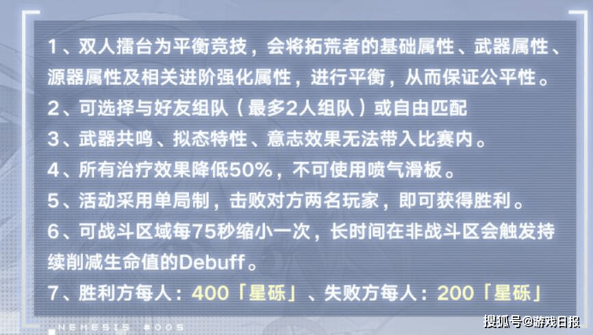 这次“MEGA双人擂台”在玩法上与巅峰联赛类似,属于平衡竞技,参与活动的玩家在基础属性、武器属性以及源器等级属性上面都被平衡了,另外像武器共鸣、拟态特性以及意志效果,都无法带入比赛之内。与巅峰联赛最大的不同之处,就在于这是一个2V2竞技活动,并且是1局定胜负(巅峰联赛积分制,先得2分获胜)。
