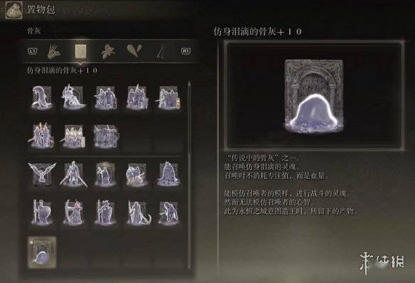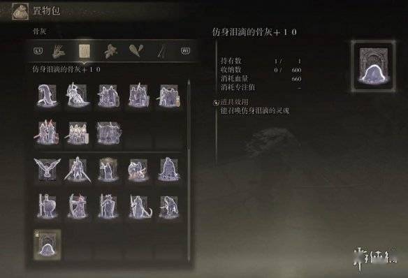 “仿身泪滴”是复制出一个你的分身,能使用你装备的武器与法术,在强化之后伤害离谱,带上他打BOSS十分安逸。不过它要到中期才能获得,与其他骨灰消耗专注值不同,它要消耗自己600点血量才能召唤。