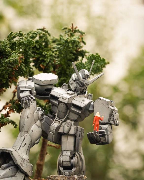 推特博主“cmajortriad”在玩高达的时候就把模型和盆栽结合在了一起,旧化的锈蚀感会有一种荒凉的感觉,看起来非常废土,但是盆栽中的绿色又象征着生命力和希望。