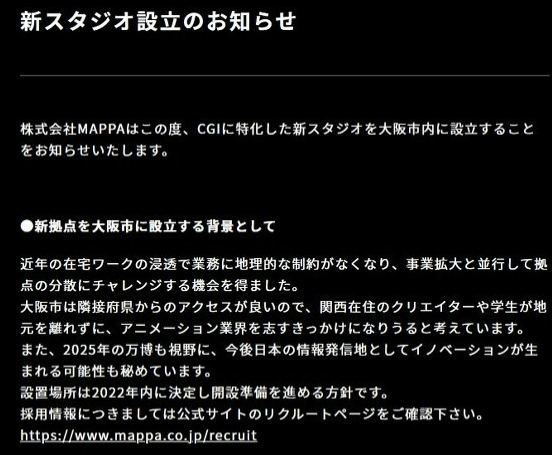 成立于2011年的日本动画厂MAPPA日前宣布成立全新工作室,预定2022年年内投入运营,主要业务强化3DCG制作的CGI事业,敬请期待。
