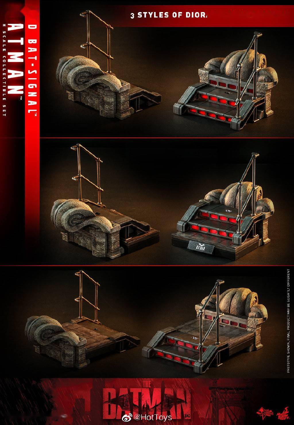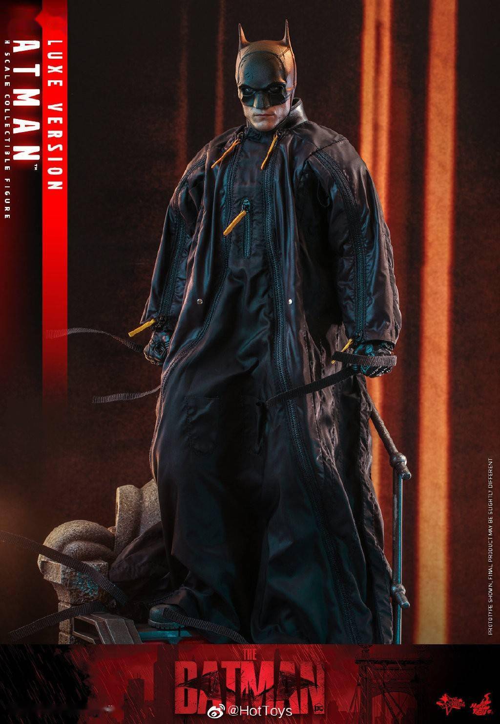 豪华版本将配备一件蝙蝠侠飞行衣、一柄黏弹枪连一枚可装拆子弹、一个由Hot Toys制作团队参照建筑大楼元素的情景地台配件 (包括: 一个内置LED发光梯级及外墙雕刻),可还原3款情景地台形态,额外附有一张爆炸场面的地台背景卡。普通版本将配备一个《新蝙蝠侠》人偶系列的主题地台。
