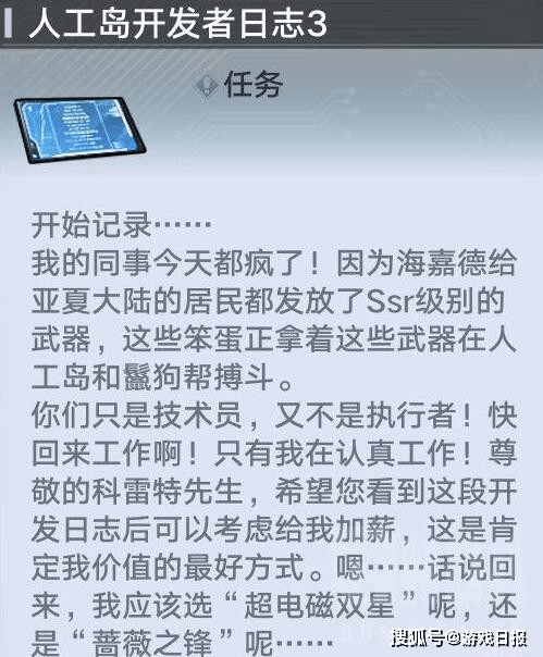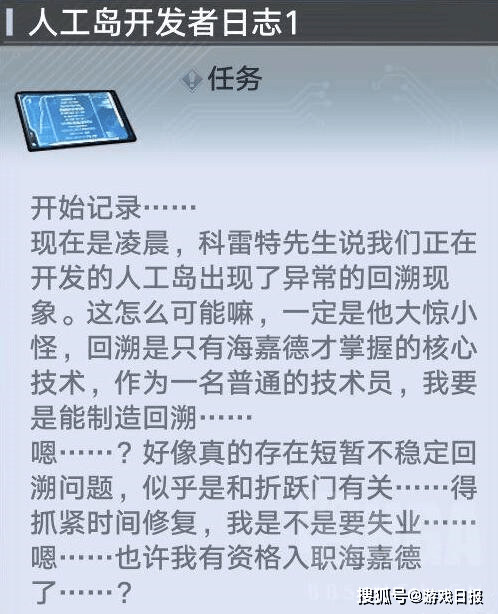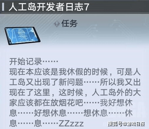 比如其中最为典型的细节,就是登上“人工岛”截取的收集“人工岛开发者日志”这个任务了,任务本身其实很普通,就是收集散布在大世界各地的开发者日志,但真正的亮点,则在于这个日志上面显示的内容,本以为是任务道具很普通,但是当玩家仔细去观察后,才发现这些开发者日志可谓是彩蛋多多。