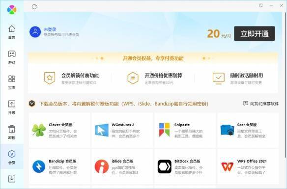 近日, 腾讯电脑管家上线“会员”板块,每月20元开通会员权益,专享付费功能。会员页面显示,开通会员可解锁付费功能,享受多款正版付费软件,比单独购买省30元,随时激活随时用,支持激活设备随时变更。
