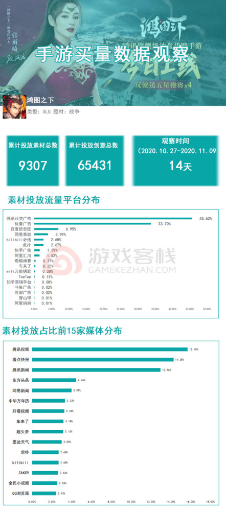下图为2020.10.27至2020.11.09期间,“宏图下”手游在媒体,流量平台,以及广告投放材料数量和创意群体等数据维度的观察。 从图上看:“宏图旗下”手机游戏旗下流量平台,腾讯社交广告占比最高45.62%;二是优秀广告33.7。 物料投放占媒体平台前15名,腾讯视频达15.7%,快报14.28。 可见,“宏图下”与腾讯其他手机游戏一样,主要在腾讯自己的平台上宣传。 此外,根据奇迈数据分析,过去一周在宏图的iOS下载总数约为95196。
