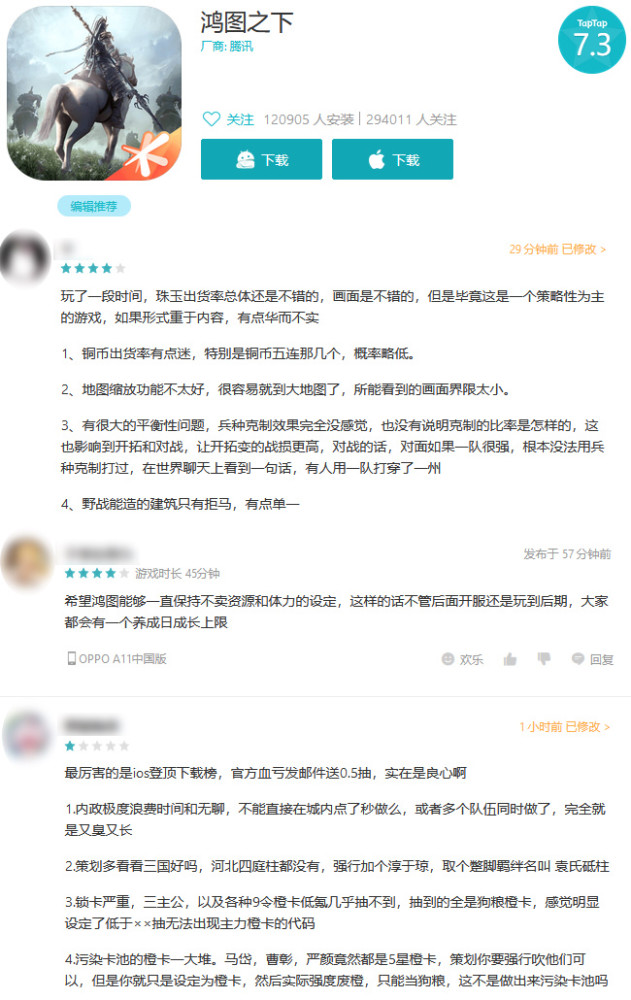 对于手游内容和宣传思路,玩家如何评价呢? 台TAPTAP,宏图的分数已经增长到7.3。 玩家说游戏画面很好,策略自由度也很高,但游戏内容有待提高。 我OS的平台,玩家最近给手机游戏总分4.8分,大多数玩家认为游戏是好的,但轻微的肝脏是不推荐的。