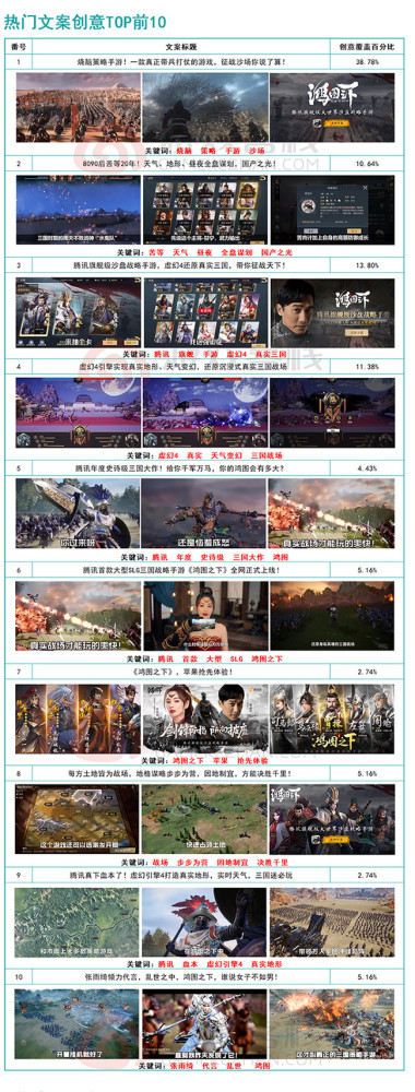 在广告创意方面,宏图邀请了在赤壁扮演周瑜角色的著名电影明星梁朝伟,以及最近在综艺节目“风浪中的妹妹”上广受欢迎的张宇琪担任明星代言。 制作了大量围绕“还原真实战场”,“旗舰沙盘策略手游”等游戏亮点的视频内容。