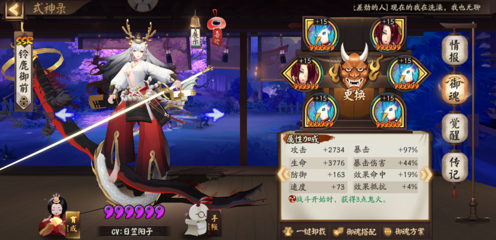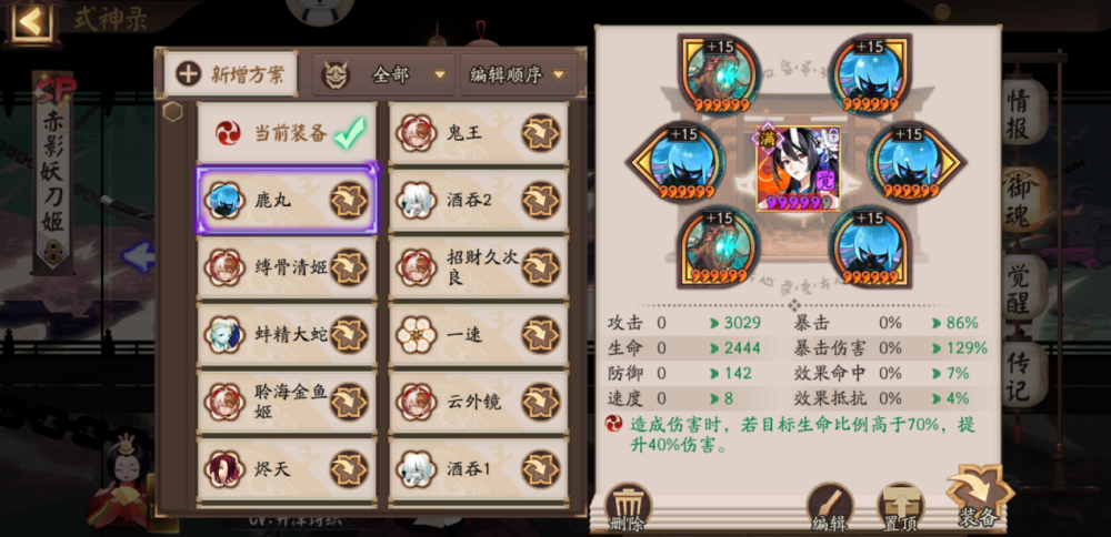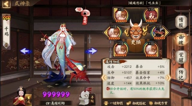 赤影妖刀姬:御魂破势,主堆攻击和爆伤,速度尾速,超星或者不超星都可。赤影妖刀姬的优势就是,自身伤害高,还有自拉条机制。重要的是,这个版本盾系式神的生存环境也比较苛刻,所以赤刀有了就业机会。加上千姬的海原贝脊,增伤越来越高,赤刀的伤害也是越来越高。