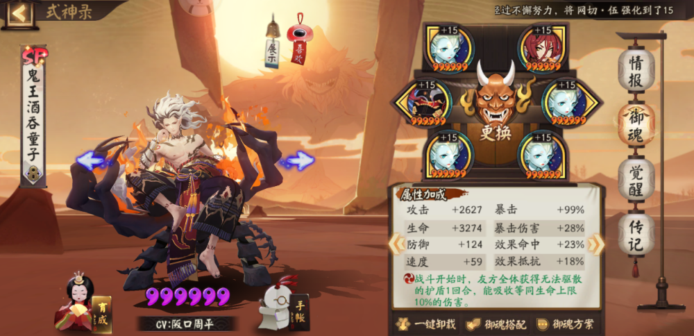 鬼王酒吞童子:御魂蚌精或者火灵,二号位速度,四号位攻击,六号位暴击。鬼王酒吞童子也具有很好的能动性,能输出能回血还能抵抗,所以六号位暴击很有必要。尤其当鬼王酒吞童子还带蚌精御魂的时候,六号位暴击还可以防对手五手投控制彼岸花。