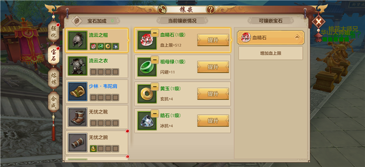 对于坦克门派来说,命门和优势就在于血量。因为坦克门派攻击输出必然不太出色,对敌人的伤害上起不到太好效果。最基本的工作就是吸引敌人集火和阻挡敌人进攻,让其他队友有攻击的机会和环境。很多人知道这个道理,因此一旦与坦克门派对上,大部分人都会选择不与坦克直接交战,而是各类控制技能阻碍坦克慢慢磨血,这种情况下如果一旦血量耗尽很难逃跑让后方辅助治疗,降低整个团队的活力。因此坦克门派不管是从个人还是团队考虑,能直接提升生存能力的血量方面是影响最大的,因此也要注意首先培养这类宝石。目前能提升血量的宝石中,血精石是提升血量的最佳宝石,同时培养血精石花费的资源也不太多,自然首先要注意血精石的培养搭配。
