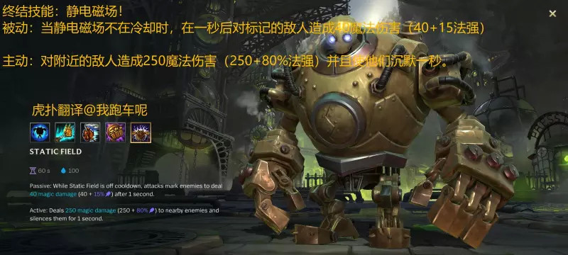 被动:当静态电磁场不冷却15(F)时,一秒钟后对标记敌人的40魔法伤害(40)