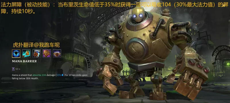 LOL手游:Wild Rift已于10月28日正式在日服,新加坡服等地区进行公测,由于中文目前为止没有被官方支持,所以这里为大家带来英雄的技能介绍,以下为英雄介绍内容 : 法力屏障(被动技能):当布里茨生命值低于35%时获得一层可以吸收104(30%最大法力值)的屏障,持续10秒。